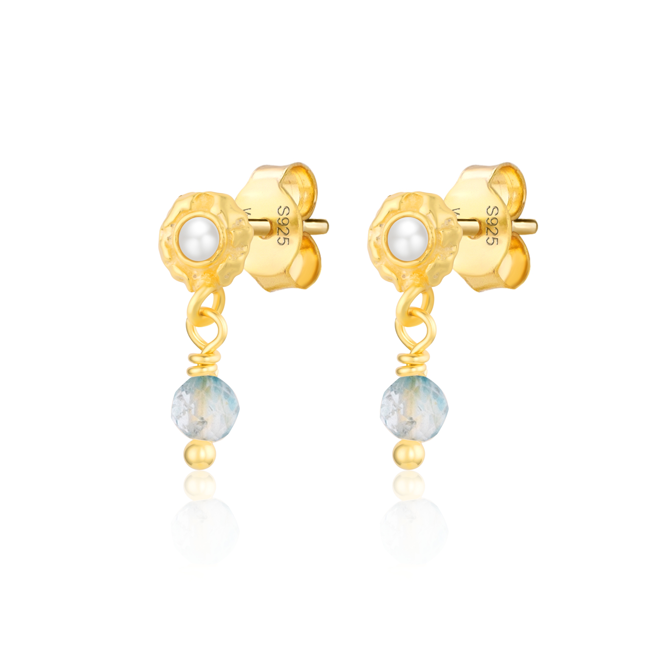 Adina øreringene er et par delikate og feminine øreringe i 14 karat guldbelagt sterlingsølv, pyntet med små ferskvandsperler og blå sten.