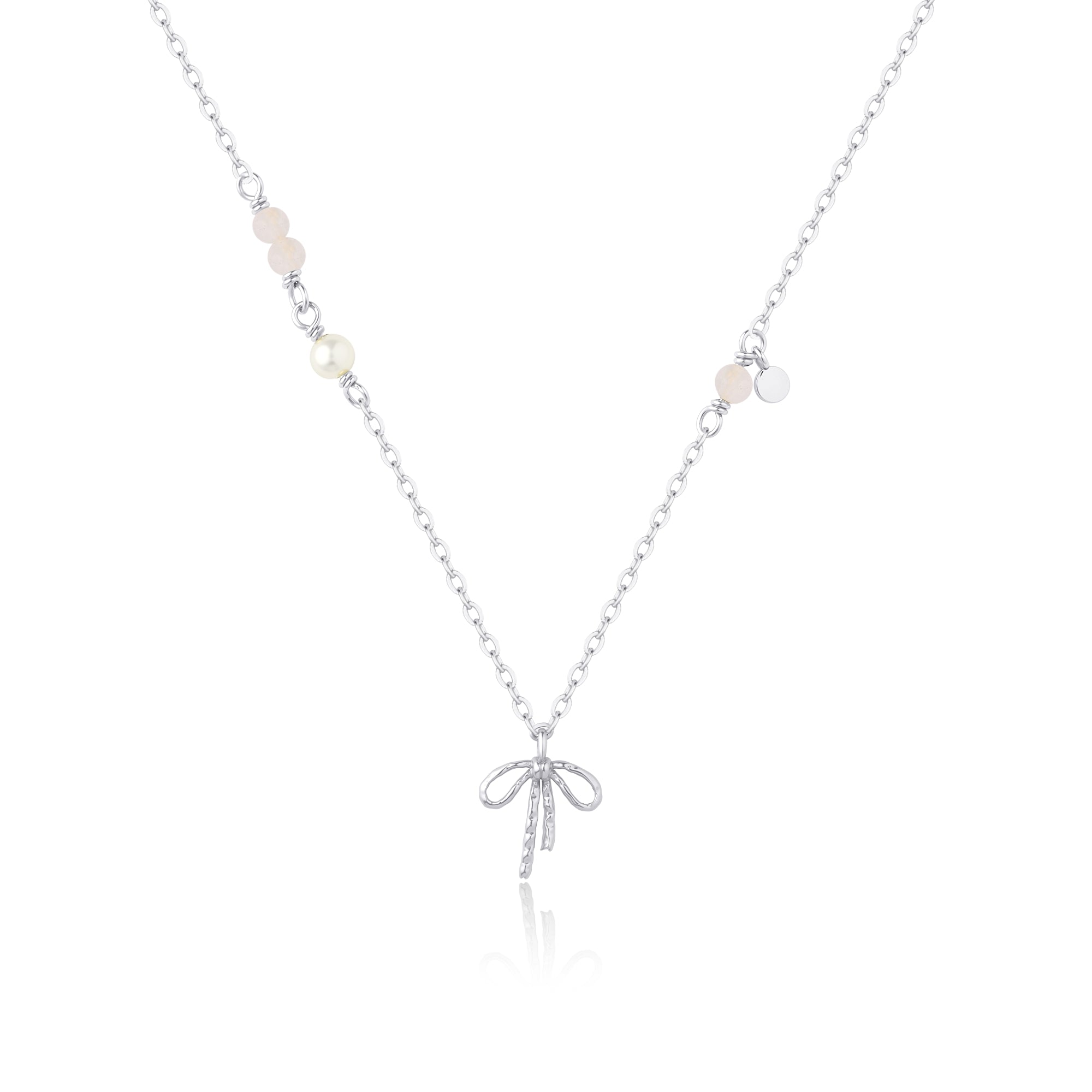 Estrid halskæden er en fin og feminin halskæde i sterlingsølv, pyntet med rosakvarts, ferskvandsperler og et smukt sløjfevedhæng. De bløde nuancer og det lette design giver et romantisk og elegant udtryk, der passer perfekt til både hverdag og særlige anledninger.